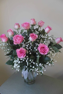 Dozen Pink Roses Arranged with babies breath while supplies last!